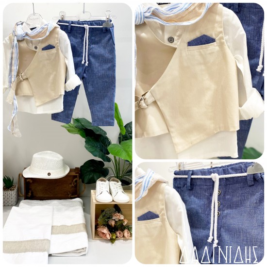 γιλέκο, παντελόνι, ζώνη, πουκαμίσα, φουλάρι και καπέλο. Γιλέκο εκρού λινό που