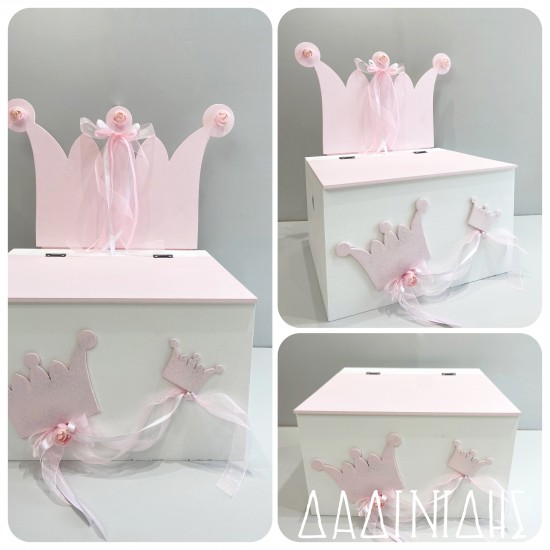 Χειροποίητο ξύλινο κουτί για τα βαπτιστικά ρουχαλάκια του μωρού σας με θέμα κορώνα.