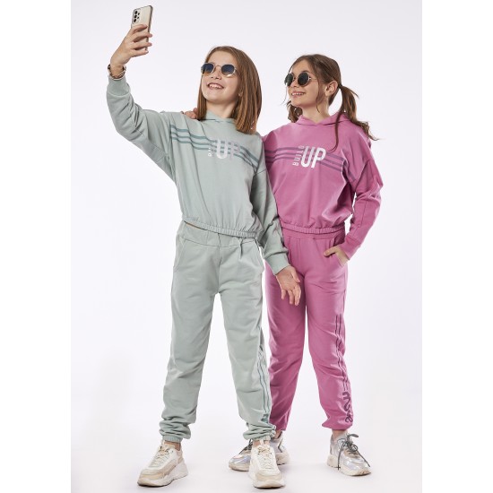 Σετ που αποτελείται από μακρυμάνικο φούτερ με τύπωμα και κουκούλα σε συνδυασμό με παντελόνι φούτερ με λάστιχο.